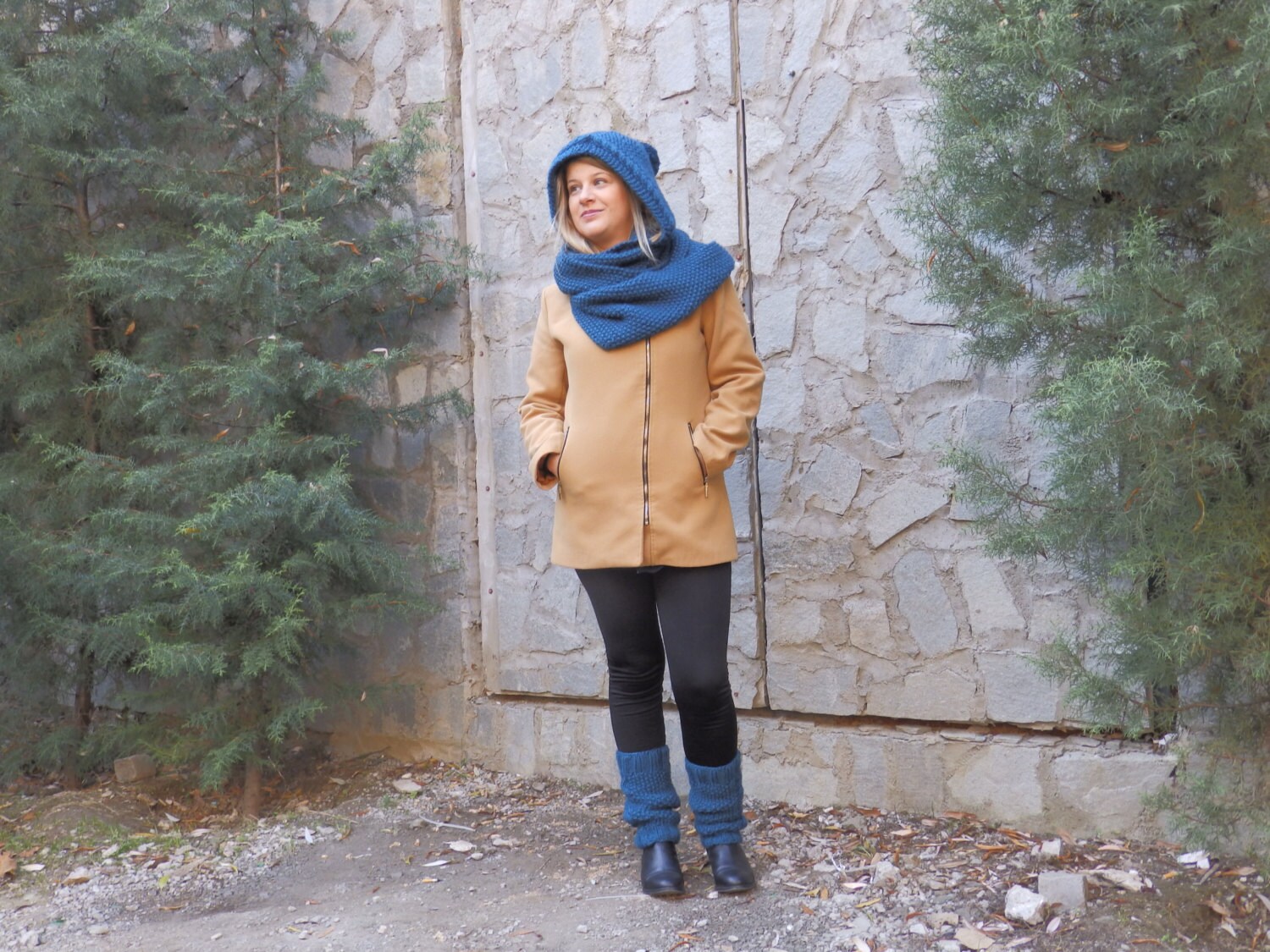 If you are looking for a special design, this soft and warm set is what you need. This hoodie oversized cowl is cozy and stylish, but also very soft and warm. Legwarmers complete the picture of a stylish and modern girl. It is easy to chance around for many different looks and styles.